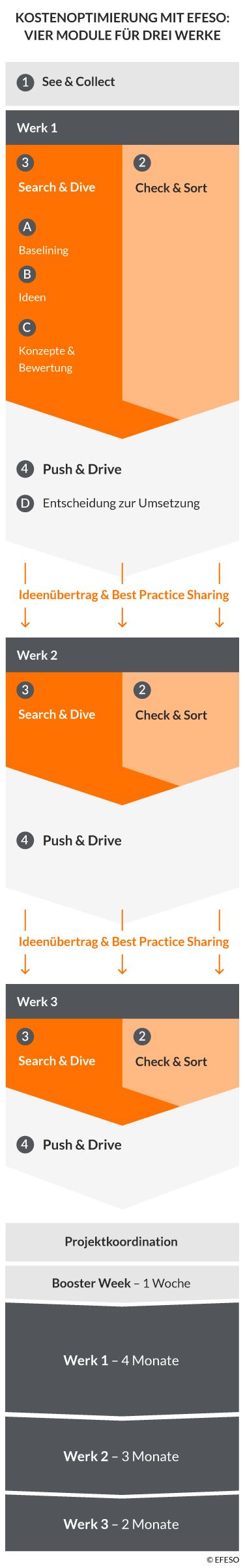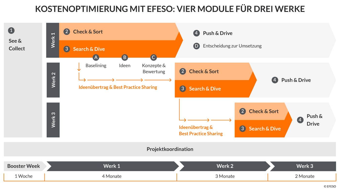 Das Projektteam organisierte sich nach diesen Kostenarten. Für jede genannte Kostenart benannte EFESO einen eigenen Teilprojektleiter, welchem das Unternehmen einen Tandempartner zuordnete. Gemeinsam konzentrierte man sich auf vier Arbeitspakete: eine Analyse der bestehenden Initiativen, die Identifikation neuer Einsparpotenziale, einer Bildung von Arbeitsgruppen mit Fachbereichen und schließlich auf die Entwicklung konkreter Maßnahmen. Somit erhielt der OEM in kurzer Zeit mehr als 100 konkrete Ansatzpunkte, um erhebliche Kostensenkungen zu realisieren. Dies waren beispielsweise: