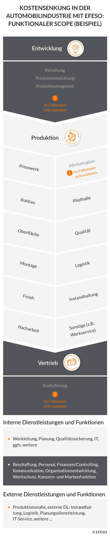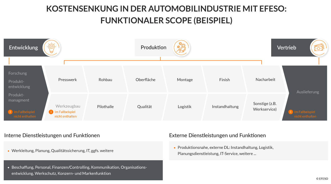 Für jedes Werk galt, dass vom Presswerk bis zur Fahrzeugfertigstellung jede Funktion einen Beitrag zur Kostensenkung leisten musste (s. Grafik 1 als Beispiel für einen funktionalen Scope zur Kostensenkung in der Automobilindustrie). Dies bildete den übergeordneten Rahmen für eine Kostenanalyse, die vier zentrale Kostenarten ins Visier nahm: