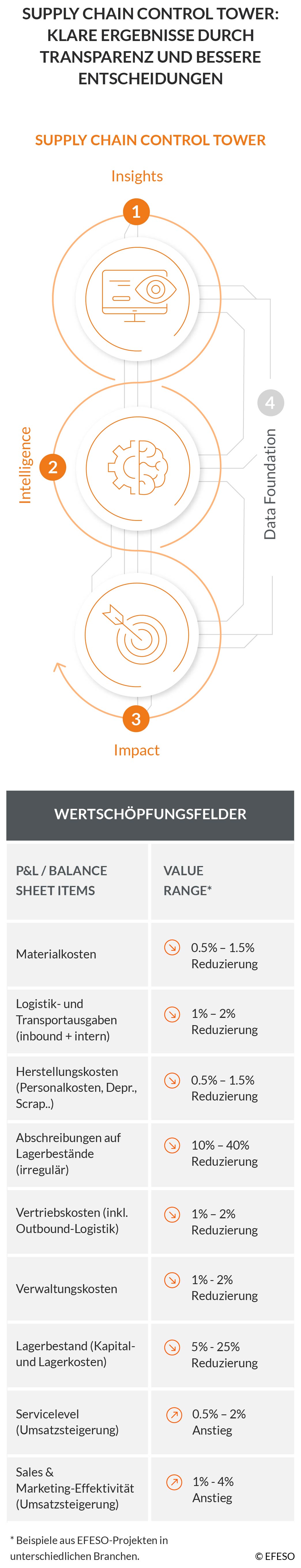 - Unternehmen, die ohne ein funktionierendes Risikomanagement agieren, verzeichnen erfahrungsgemäß erhebliche Margenverluste (Stichwort „Burning Platform“). Der Supply Chain Control Tower ermöglicht neben den genannten Punkten KPI‑relevante Verbesserungen wie niedrigere Transportkosten, die Vermeidung von Luftfracht, reduzierte Verlegungskosten und optimierte Bestände.
