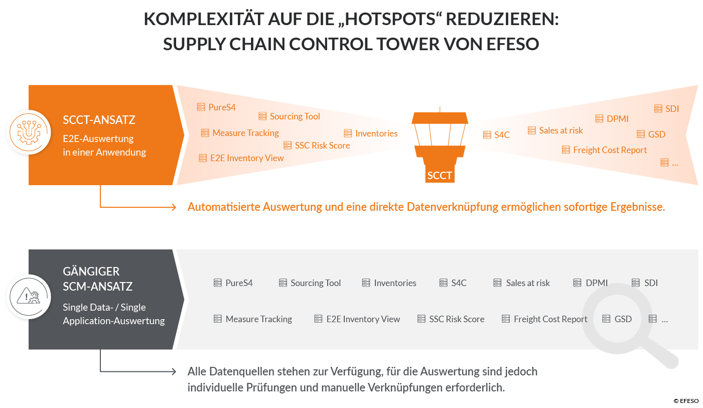 Das Management identifizierte folgerichtig das Thema „Transparenz“ als kritischen Faktor. Aufgrund der positiven Erfahrung aus vorangegangenen SCM-Projekten engagierte es das Team von EFESO, um bei Problemen sofort erkennen zu können, welche Produkte und Kunden im Wertschöpfungsnetzwerk betroffen sind. In diesem Fall lag der Fokus darauf, in vier Monaten einen „Supply Chain Control Tower“ (SCCT) als zentrale Technologie in der SCM- / Einkaufsorganisation zu etablieren – und somit in kurzer Zeit von diesen Vorteilen zu profitieren:
