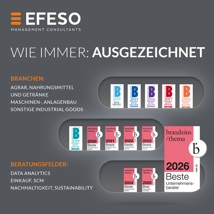 In der aktuellen Studie und größten deutschen Consulting-Umfrage bestätigten die Befragten die bereits in den Vorjahren erreichte Positionierung von EFESO im Branchensegment „Maschinen-, Anlagenbau“. Zusätzlich setzt sich EFESO im Segment „Agrar, Nahrungsmittel und Getränke“ an die Spitze und ist bei „Sonstige Industrial Goods“ vertreten. Auch in den Beratungsfeldern „Data Analytics“, „Einkauf, SCM“ sowie „Nachhaltigkeit, Sustainability“ des brand eins-Rankings ist die Operations-Beratung präsent.